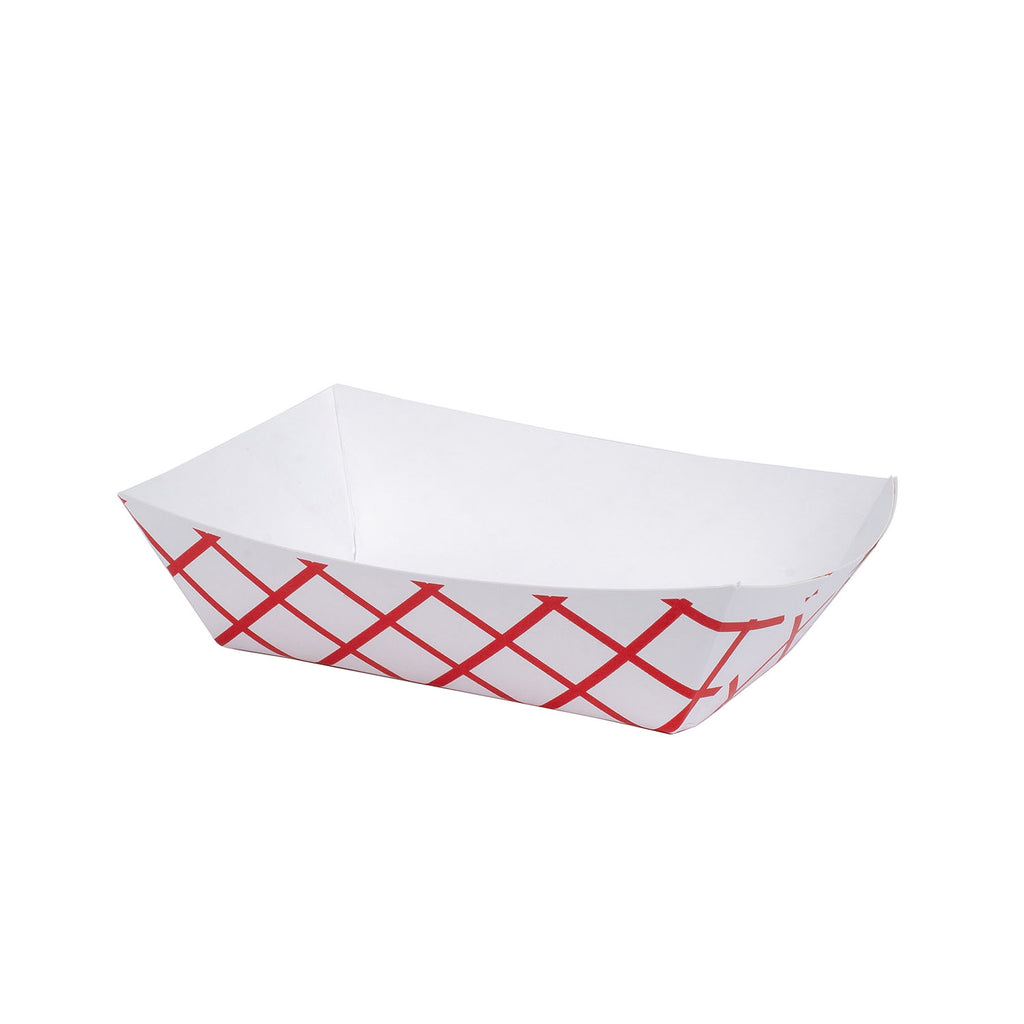 A durable and versatile red plaid paper tray perfect for serving a wide range of snacks, sides, and finger foods. These open-top trays are built from strong, one-piece SBS paperboard with a grease-resistant interior coating to prevent leaks and mess. Great for concession stands, food trucks, cafeterias, and events.